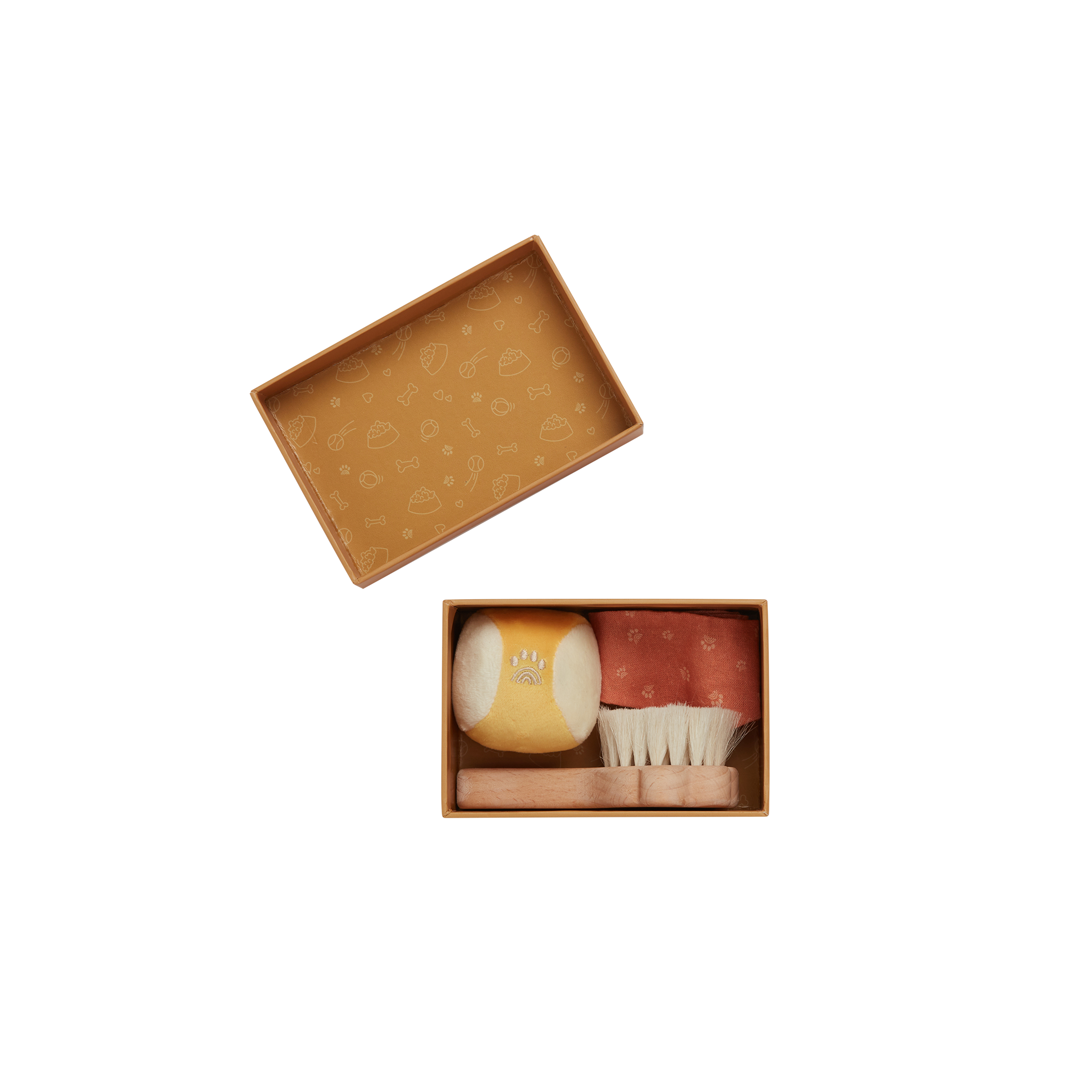 Embrace the adventure of puppy parenthood with the Starter Set – packed with essentials to pamper your ! Open the gift-ready box to find a cotton bandana printed with our signature Dinkum Dog rainbows, a plush magnetic ball, and a wooden brush to keep Dinkum Dog coats shiny and clean. The ball is constructed with a magnetic element that allows the Dinkum Dogs to hold their favourite bone in their mouth, so they never miss a delicious surprise. Pair with the and for pretend play fun that will keep your pup (and kiddos) entertained for tail-wagging hours!