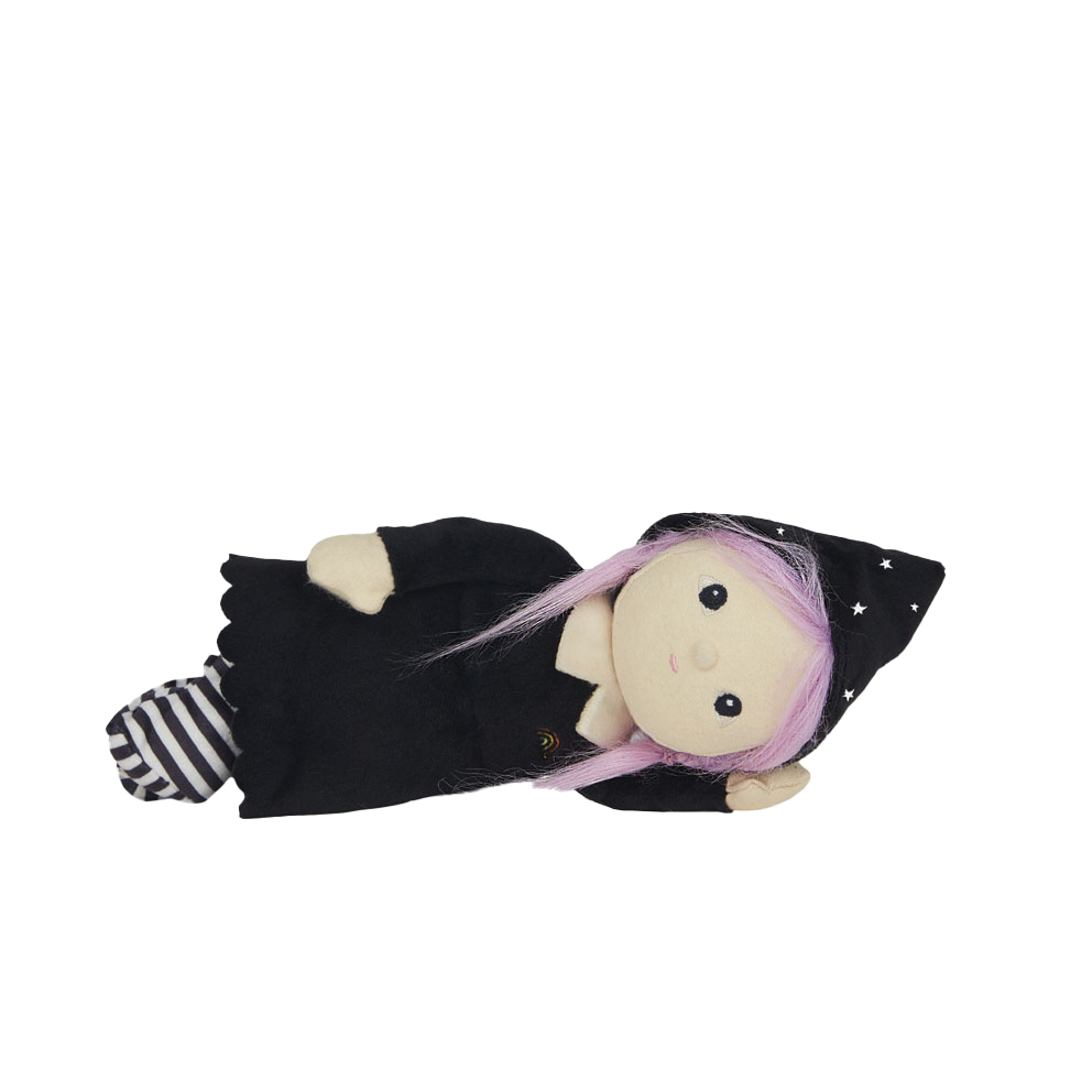 Why You’ll Love It: Willa Witch lives in Holiday Hollow, where pumpkins glow all year and the wind hums lullabies through the trees. With lilac pigtails tucked beneath her starry pointed hat, she’s a pocket-sized enchantress who loves brewing giggles, chasing moonbeams, and trading Halloween treats for treasures as the village’s beloved Switch Witch. Dressed in her midnight-black velvet onesie and twinkling glow-in-the-dark tights, Willa is ready for any magical moment. The stars on her hat light up the night, and her glowing collar makes her easy to spot during broomstick hide-and-seek. Whether she’s swapping sweets for surprises, curling up for a cozy bedtime story, or floating through a world of make-believe, Willa Witch is pure spellbound charm. I belong to the HOLIDAY HOLLOW realm. Discover more treats .