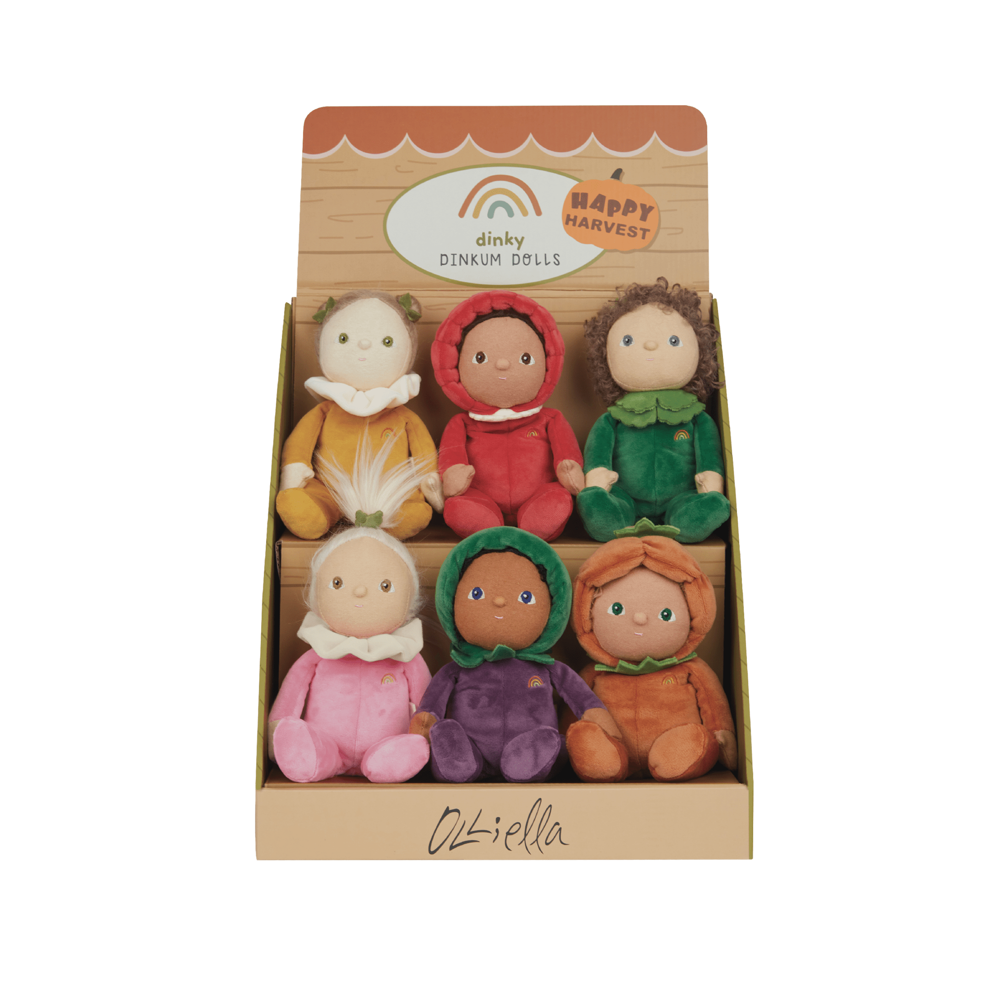 Why You’ll Love It: A side of the veggies that no one can refuse, the Happy Harvest Dinky Dinkums have sprouted and are ready to be collected from the garden! Meet the entire crew, Perry Pumpkin, Roxy Radish, Marley Mushroom, Cora Corn, Gene Greens and Ellis Eggplant.These limited-edition, collectible, pocket-sized, and loveable friends are ready for any adventure! The Dinky Dinkums Happy Harvest Collection comes packaged in a cardboard display stand for the complete market day effect.