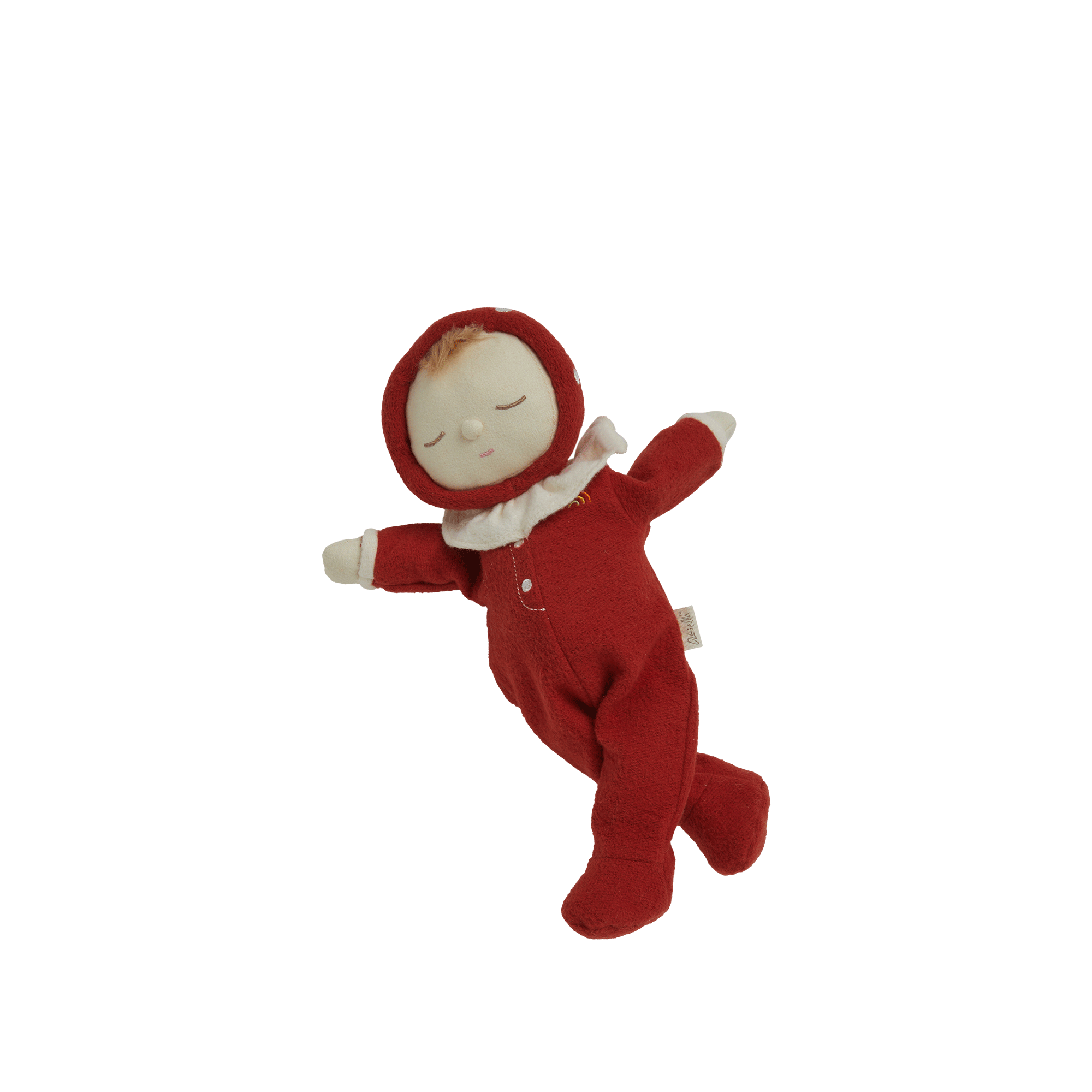 Why You’ll Love It: Rosy red and ready to snuggle, Toadstool Moppet brings a sprinkle of forest magic to every cuddle. With a mushroom-cap hood complete with embroidered spots, a frilly collar, and the softest cottony suit, this Dozy Dinkum is made for dreaming. A patch of blonde hair peeks from beneath their bonnet, and their gently weighted body is just the right size for tiny arms to hold close. Soft, safe, and machine washable, Toadstool Moppet is designed for day one and made to be loved forever. The perfect first friend for woodland wanderers and sleepy time snugglers alike.
