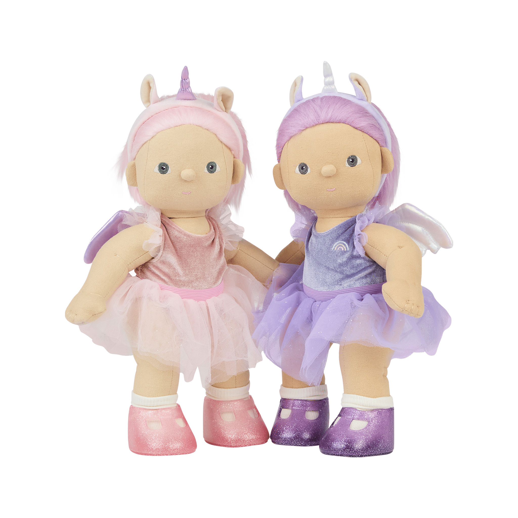 Why You’ll Love It: Dream Dinkum Doll Violet brings a little one’s world of magic and dreams to life. Made from soft fabric and sporting an outfit designed with shimmering details, Violet is always ready for adventures filled with wonder. Dressed in a velvet leotard with a glittery tulle tutu, plush iridescent wings, and a sparkling unicorn headband, Violet is made for flights of fancy and sweet snuggles alike. With posable arms, legs, and a head that moves, Violet can sit, stand, and pose for all sorts of imaginative play. Glittery shoes and cozy socks complete the enchanted look, making Violet the perfect companion for twirls, tea parties, and dreamy naps. The soft cotton body and removable outfit mean Violet is ready to be loved, dressed, and cherished through every adventure. Let your imagination soar with Violet by your side, where every moment is touched by magic.