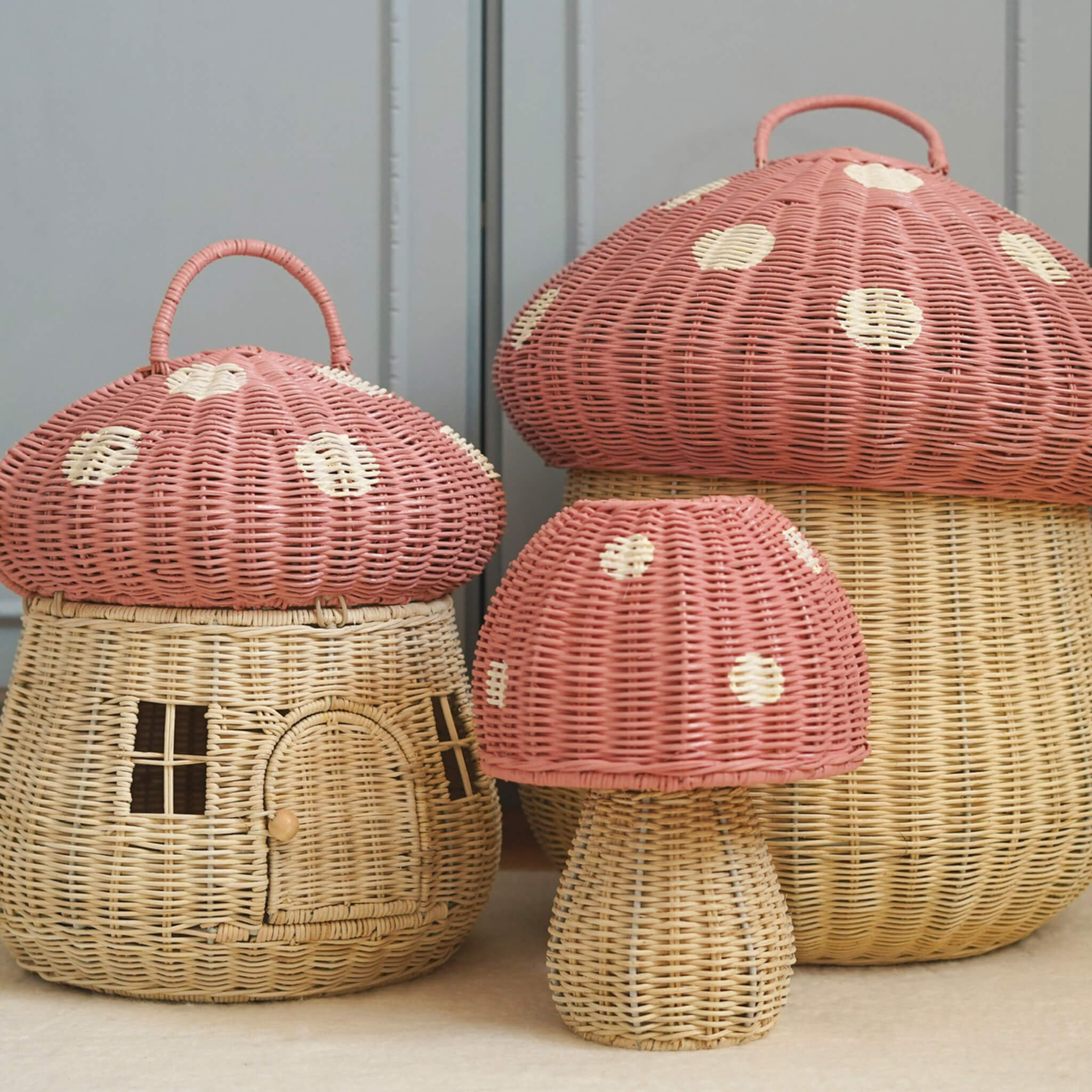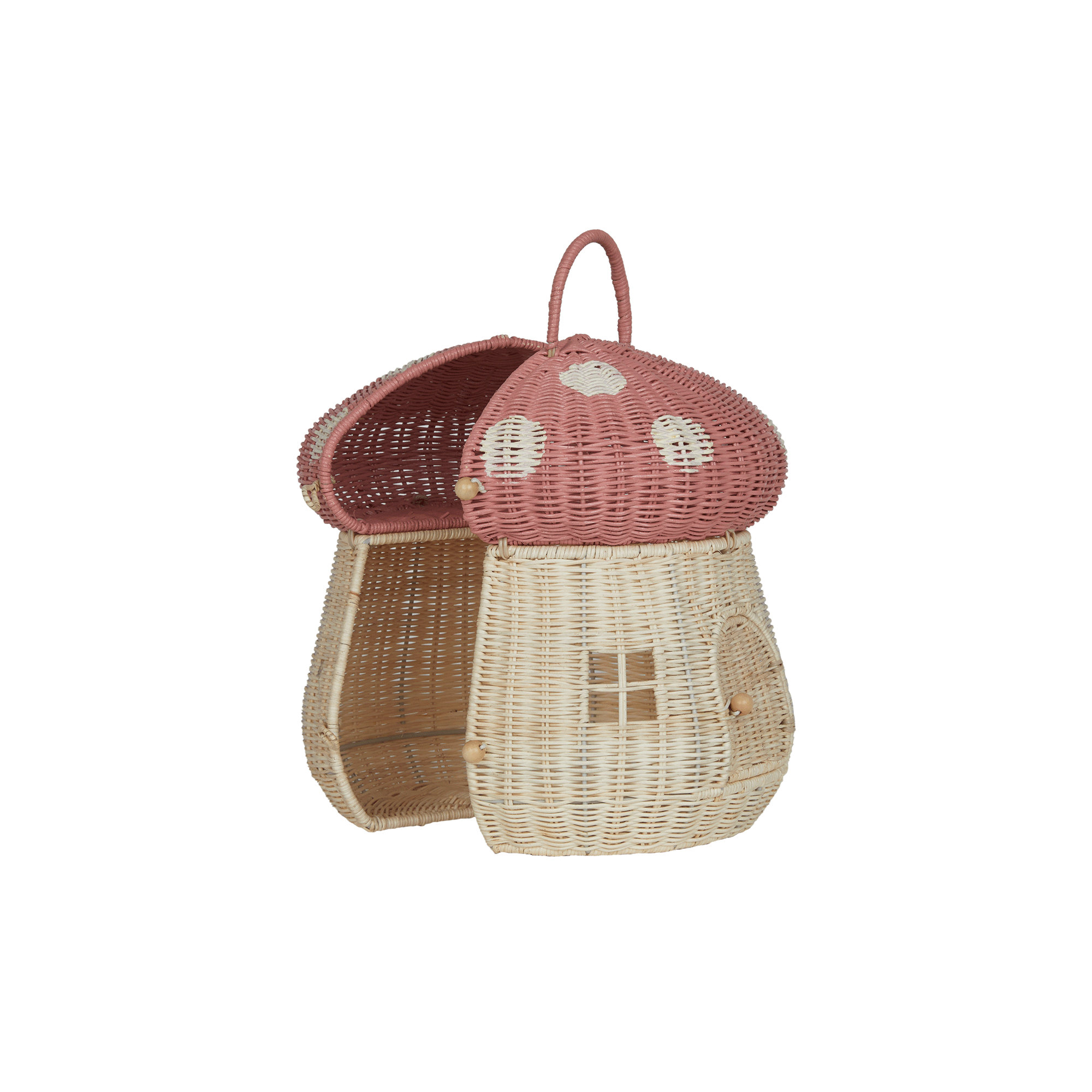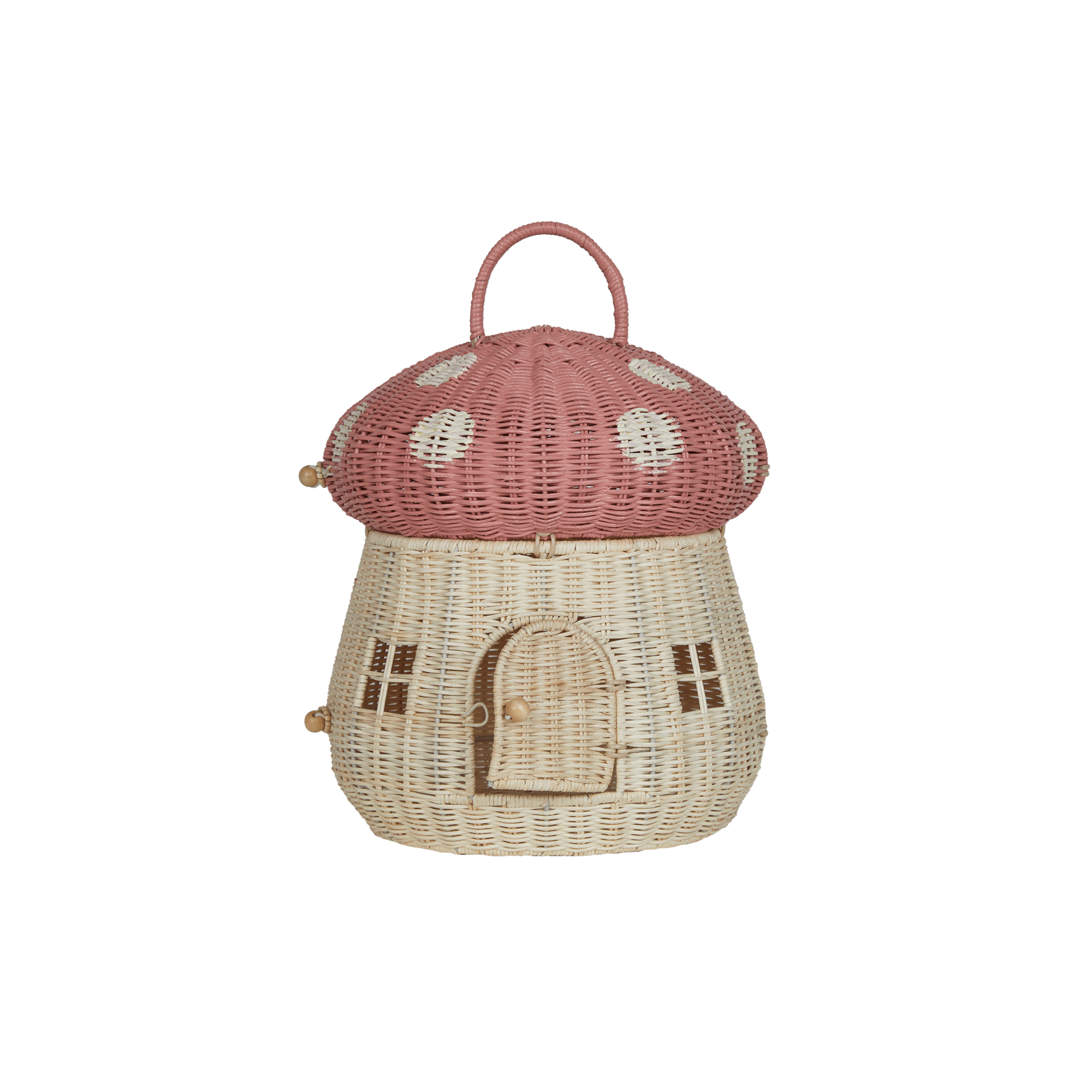 Why You’ll Love It: A cozy little mushroom home, just waiting for tiny adventurers to move in. The Mushroom Doll House in Musk is the soft pink playhouse your or have been dreaming of! Handwoven from natural rattan, this magical mushroom features two playful levels, one at ground level, and a second floor on a shelf for all kinds of stories to unfold. The wooden door swings open with ease, while the two square windows let your little one peek inside at all the magic waiting to happen. The wooden button clasps on the side make opening and closing the mushroom house a breeze, transforming it from a sweet decor piece into the stage for endless adventures. Perfect for playtime, perfect for display, and oh-so-perfect for inspiring a whole world of imaginative fun. The Mushroom Doll House in Musk is the kind of home where imagination blooms!