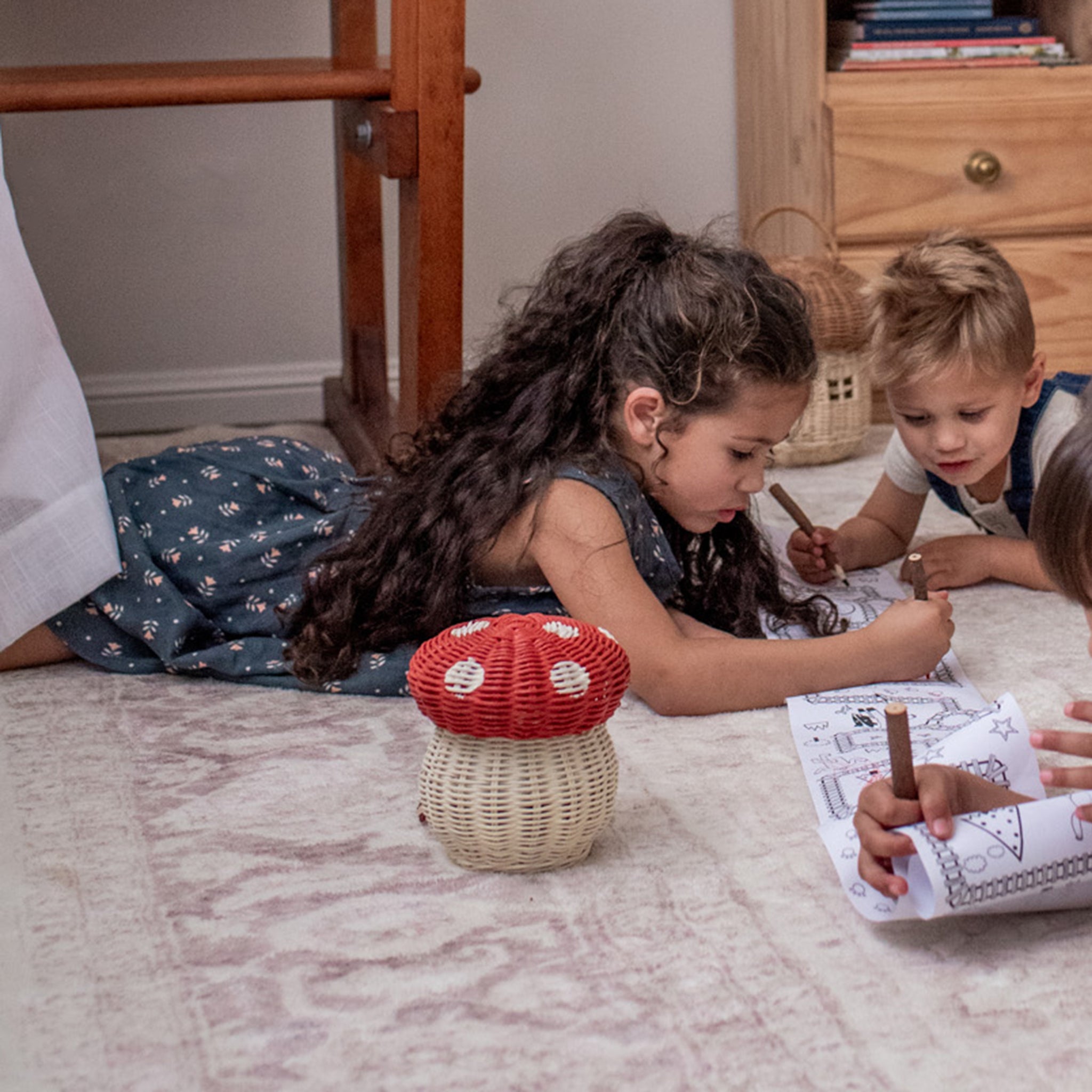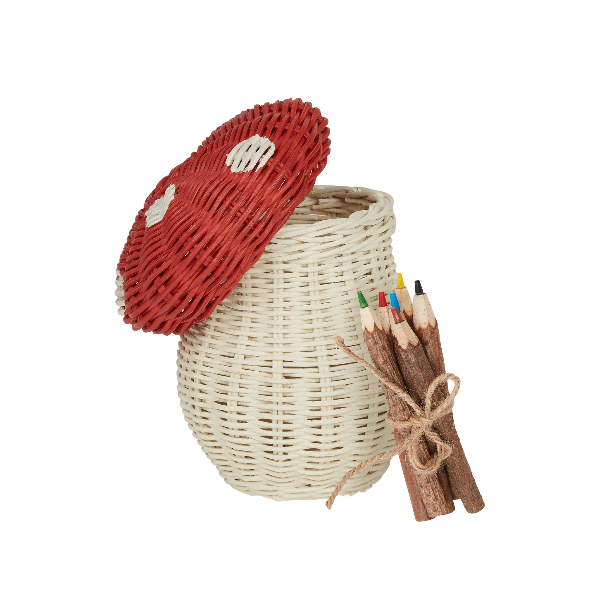 The Porcini Basket now comes in Red – Including Twig Pencils making a stylish stationary set for crafty little ones! Inspired by woodland adventures, the Porcini Basket in Musk is handwoven from 100% Rattan. Open the cap and find a set of six beautiful hand-carved wooden Twig Pencils inside. Watch little ones create beautiful art with the easy-hold coloured pencils – pair with for the ultimate craft-ernoon! The Porcini Basket makes a magical hideaway for and other teeny treasures. Or separate the Porcini Basket to make a cup and bowl for an imaginative play prop. Bring nature to the playroom with this wonderful woodland-themed multi-use basket for creative kiddos! Style with our and for an enchanting woodland space.