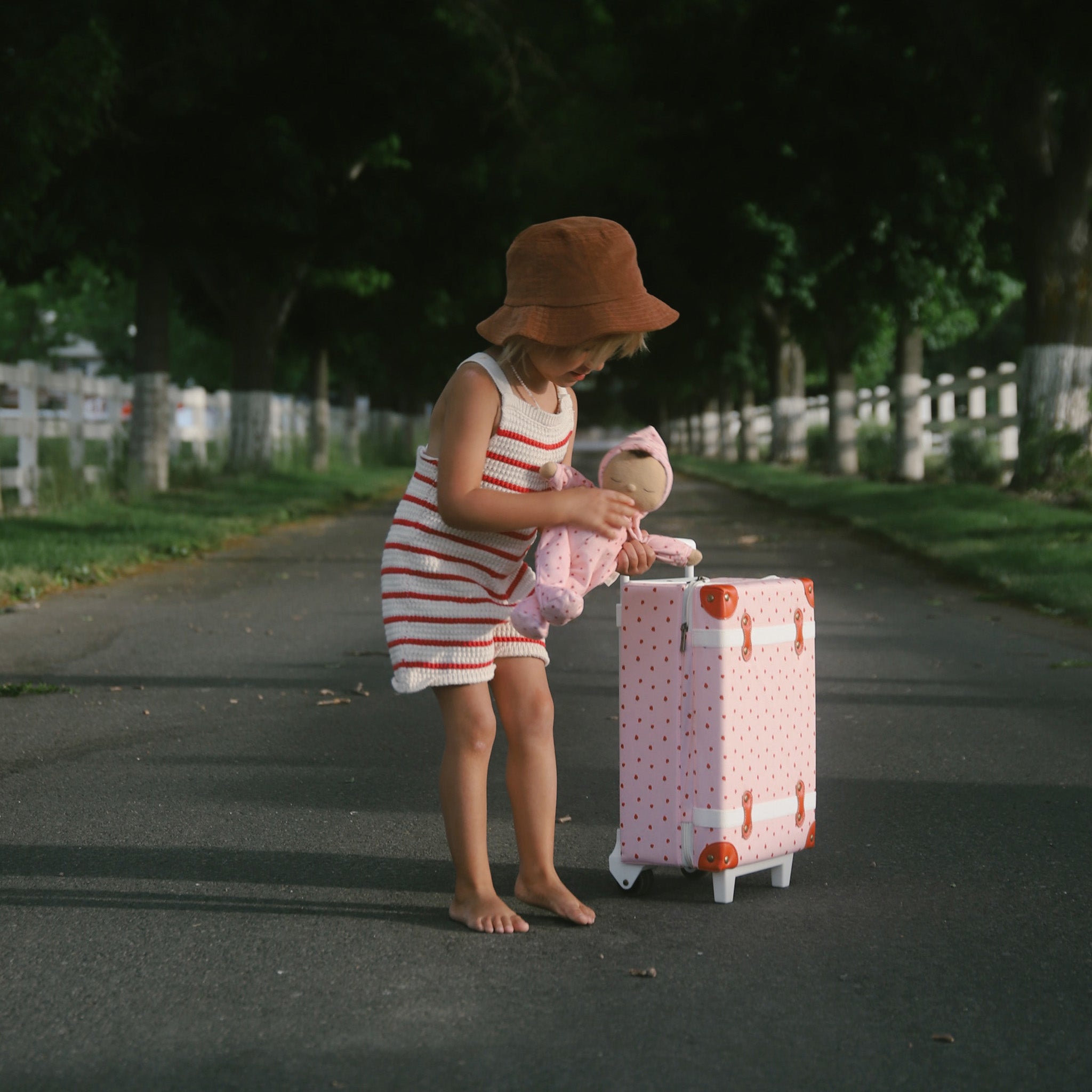 Why You’ll Love It: Embark on adventures with the adorable See-Ya Suitcase – Strawberry! This charming kids’ suitcase, featuring a delightful strawberry print, is perfect for little travellers. Ideal for sleepovers, weekend getaways, and playful journeys, this suitcase offers both style and functionality. The See-Ya Suitcase comes with a sturdy, retractable handle for easy rolling, making it simple for kids to manoeuvre. An exterior elastic band ensures that treasures and toys, like your Cozy or Dozy Dinkum friends, stay secure during travel. With its vintage-inspired design and sweet strawberry motif, this suitcase adds a touch of whimsy to every trip. The See-Ya Suitcase – Strawberry is more than just luggage; it’s a delightful travel companion for your child’s adventures. The perfect kids’ suitcase for sweet journeys!