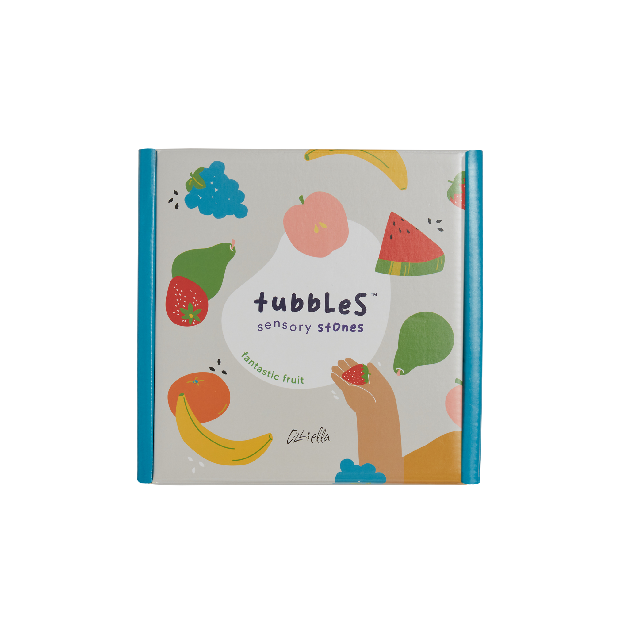 Tubbles Sensory Stones are perfectly weighted and tactile, drawing children of all ages into a world of imaginary play. Crafted from a unique mix of vibrant resin and natural granite, Tubbles are the building blocks of imagination. Watch your kiddos stack, play, and create endless stories in their sensory tub, mud kitchen, bath, and at the beach. More than a play prop, Tubbles are weighted for calm and make a grounding anchor point for fidgety fingers. Each set comes packed in a gift-ready box and includes seven sensory stones, a small matching bowl, and a mesh bag to keep the set together, and for easy cleaning. Inside the Fantastic Fruit box, you will find one strawberry, orange, apple, banana, watermelon, and grapes. Whether your medium of choice is play dough, mud, washable paint, or sand, these tactile sensory stones invite children to explore, experiment, and let their imaginations soar. Mix, match, and trade stones with the and .